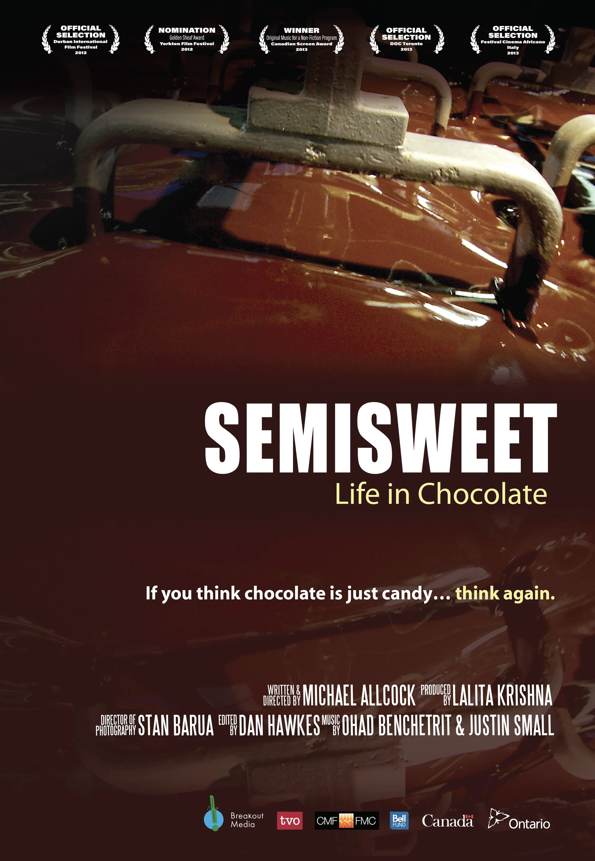 Three continents, four stories, and one deep connection: the complex world of chocolate. In the wilds of Northern Canada are Ron and Nadine who make raw chocolate like the Aztecs. In Hershey, Pennsylvania, is Hershey employee, Jonathan. In West Africa, are plantation workers, Noufou and Mamoutou. In Paris, is chocolatier, Patrick Roger. Semisweet: Life in Chocolate follows the unique journeys of people whose lives are transformed by chocolate.